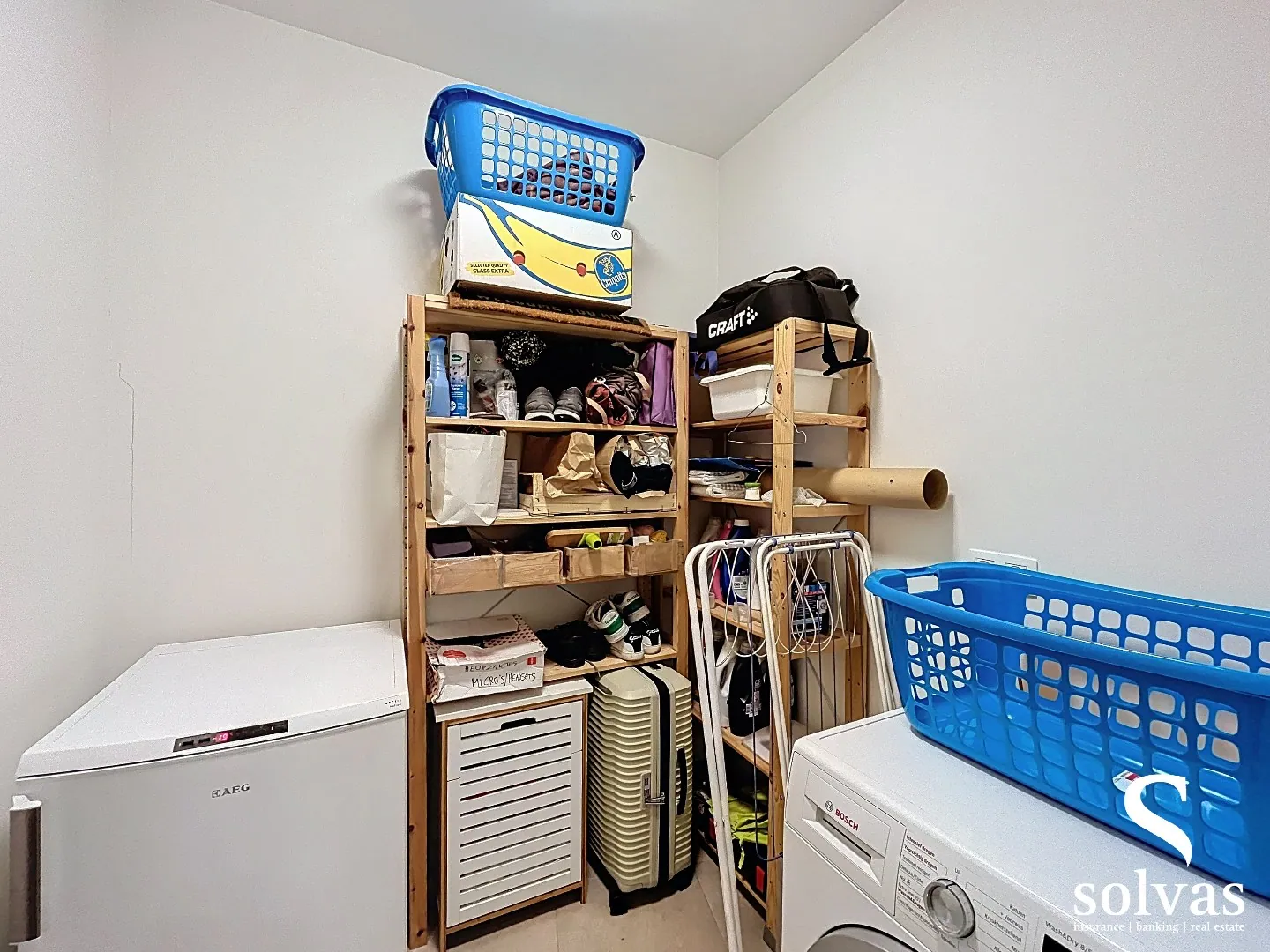 De indeling omvat een leefruimte met open keuken, twee bergingen, twee slaapkamers, een badkamer en een apart toilet. Een staanplaats en een ondergrondse berging zijn inbegrepen in de huurprijs.
