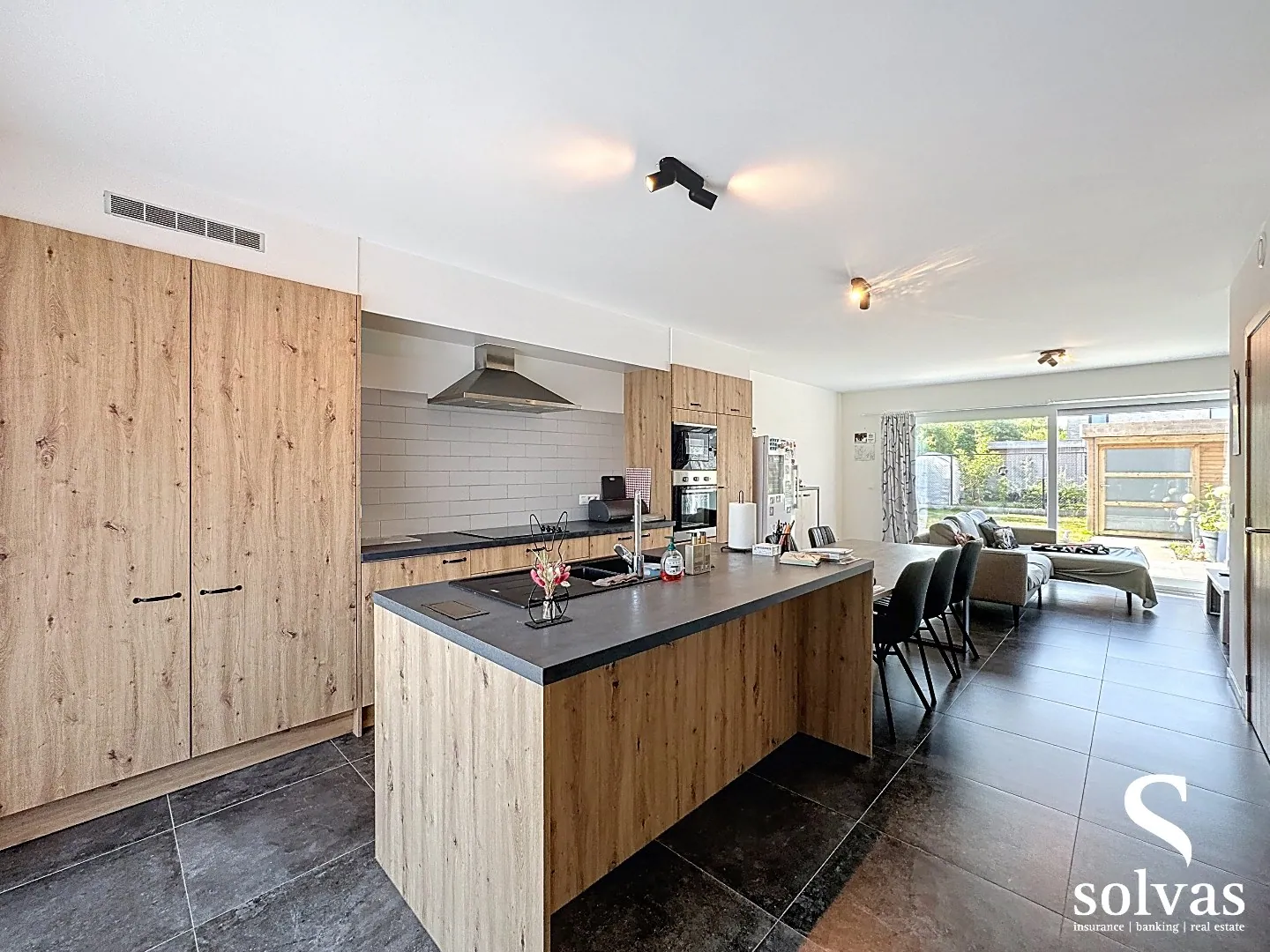 De indeling luidt als volgt: inkomhal met gastentoilet, een open en volledig uitgeruste keuken met keukeneiland en een lichtrijke woonkamer met zicht op en toegang tot de tuin. Eveneens op het gelijkvloers is er een handige berging/wasplaats.