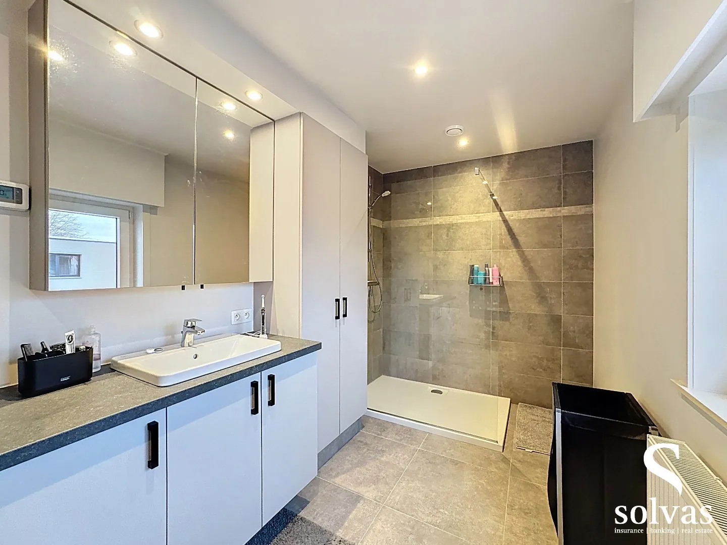Op de eerste verdieping zijn er drie volwaardige slaapkamers, waarvan één met ... ingemaakte kasten. De badkamer beschikt over een moderne inloopdouche, lavabo en toilet. Daarnaast is er een ruime zolder, ideaal als extra bergruimte. Het gelijkvloers is voorzien van vloerverwarming en alle ramen beschikken over automatisch bedienbare rolluiken.