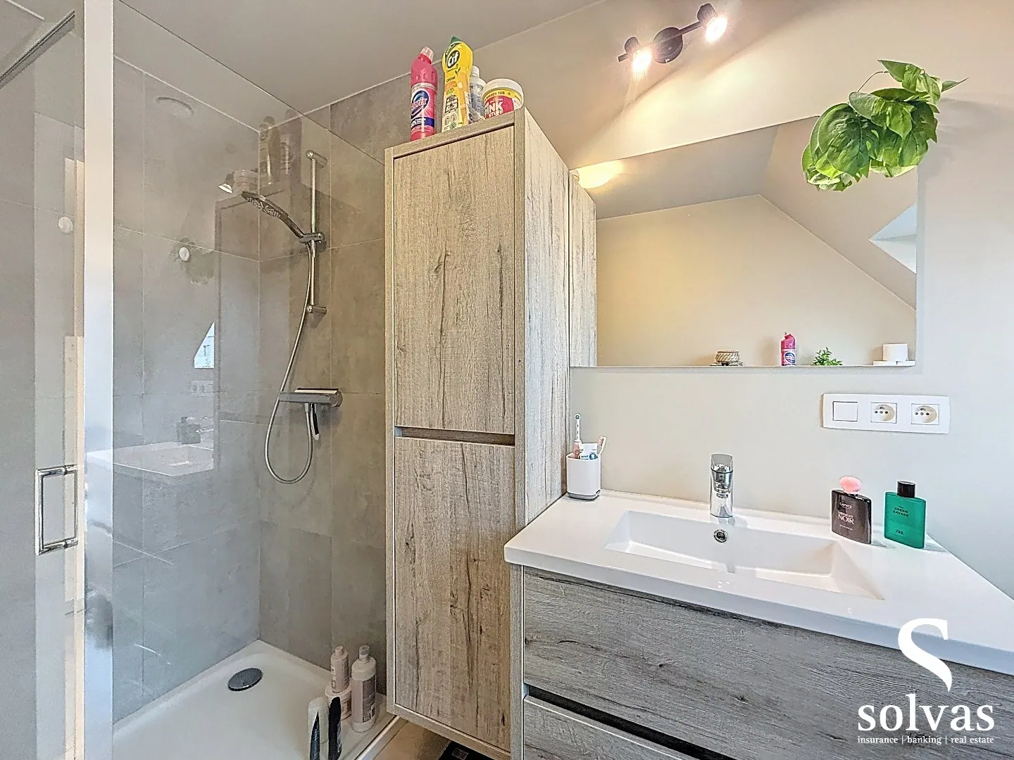 Via de inkomhal bereikt u het eerste verdiep, waar zich de aangename leefruimte met open, volledig uitgeruste keuken bevindt. Aansluitend is er een praktische berging. Vanuit de leefruimte heeft u toegang tot het ruime, zonnige terras, waar u in alle rust kan genieten van de zon in de namiddag en avond. Op deze verdieping is er ook een apart gastentoilet.