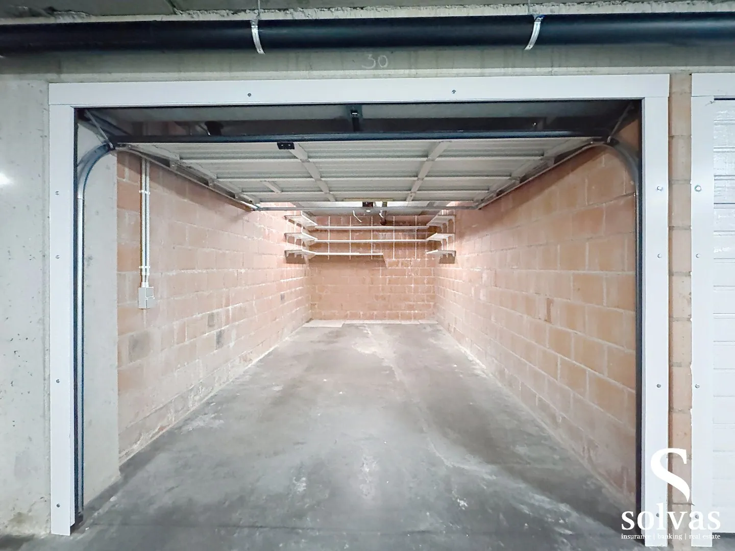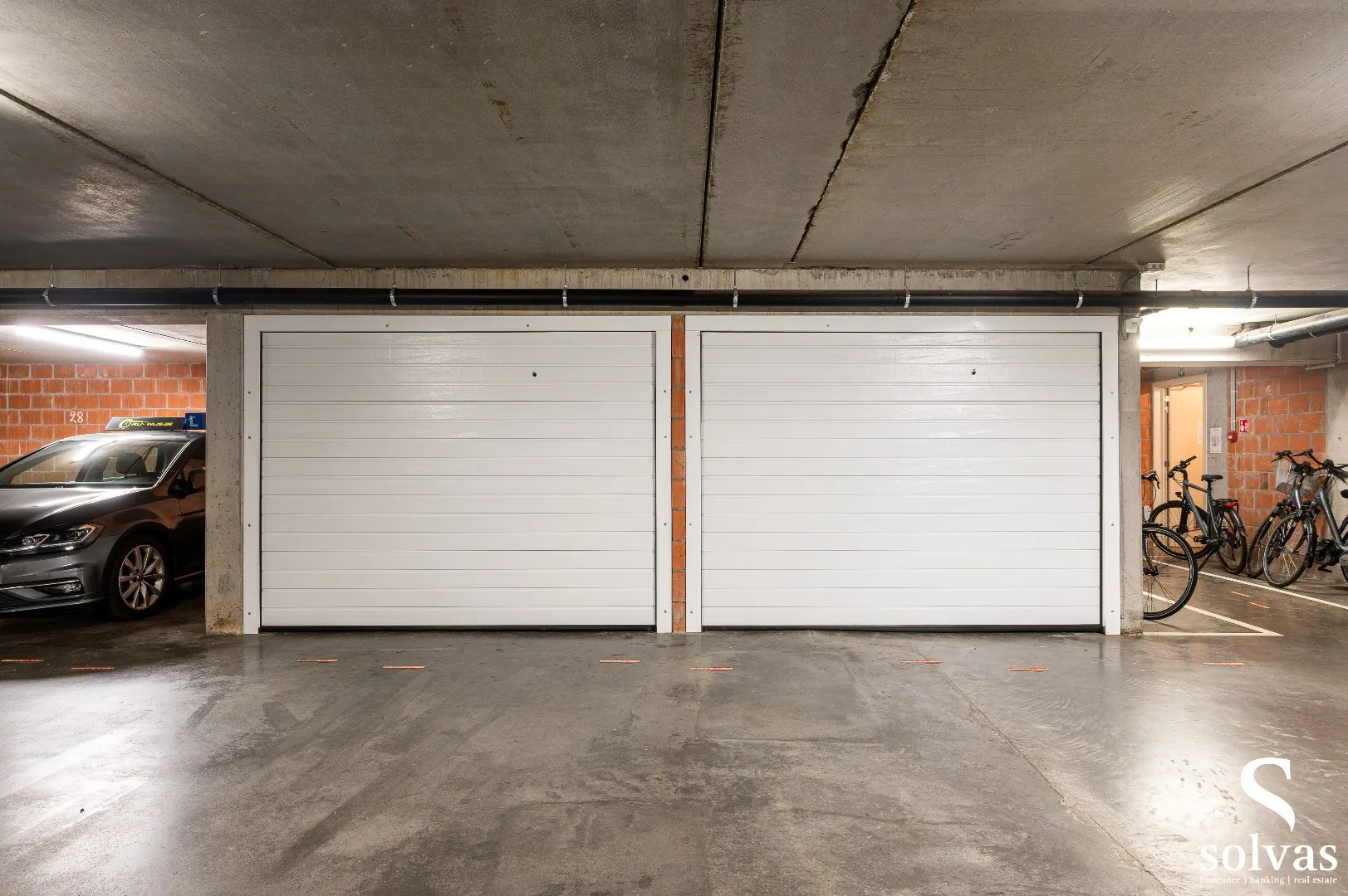 Zowel de toegang tot de parkeerkelder als de garagebox zelf gebeurt via een elektrische poort met afstandsbediening. De garage is voorzien van verlichting, elektriciteit en enkele wandplanken.