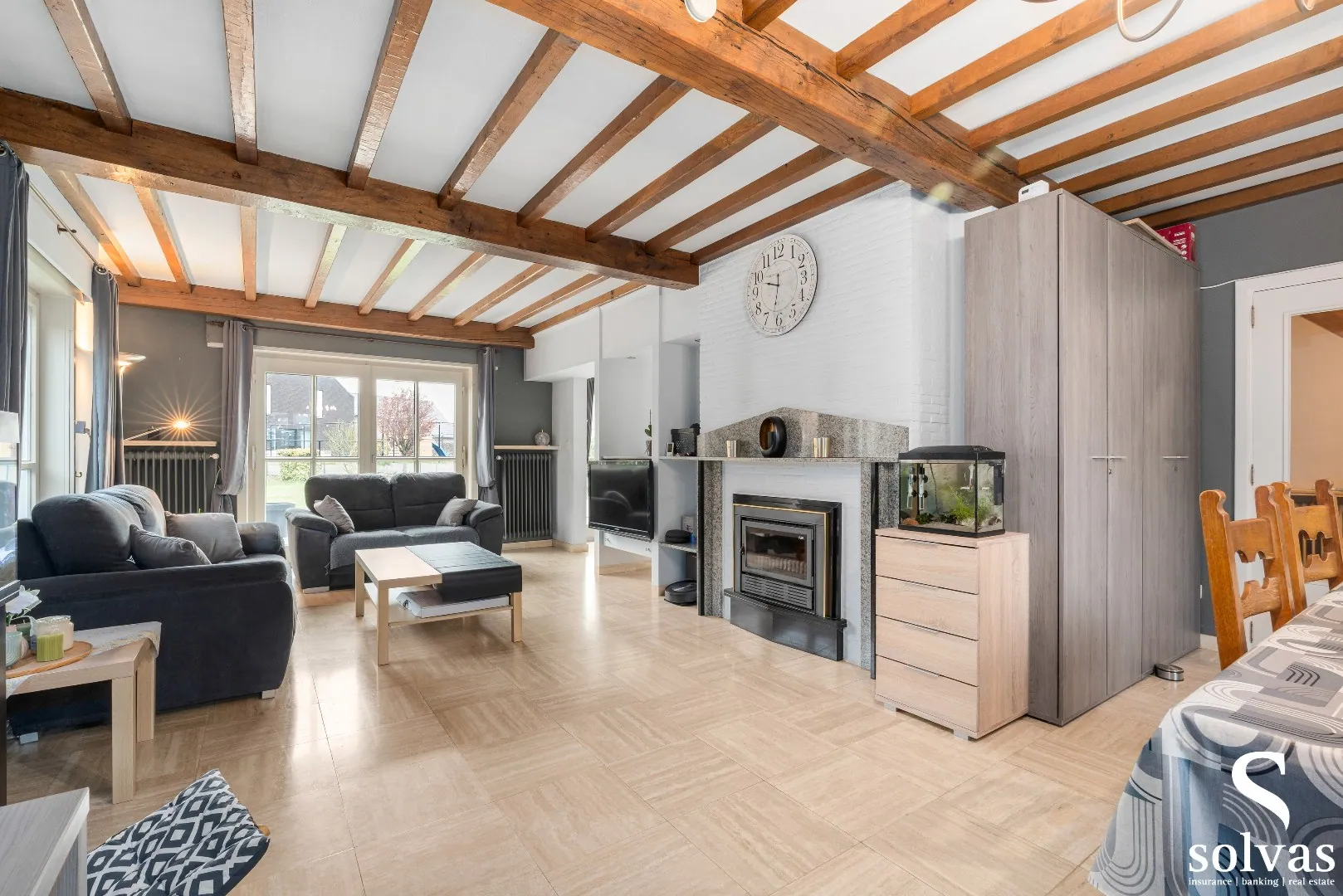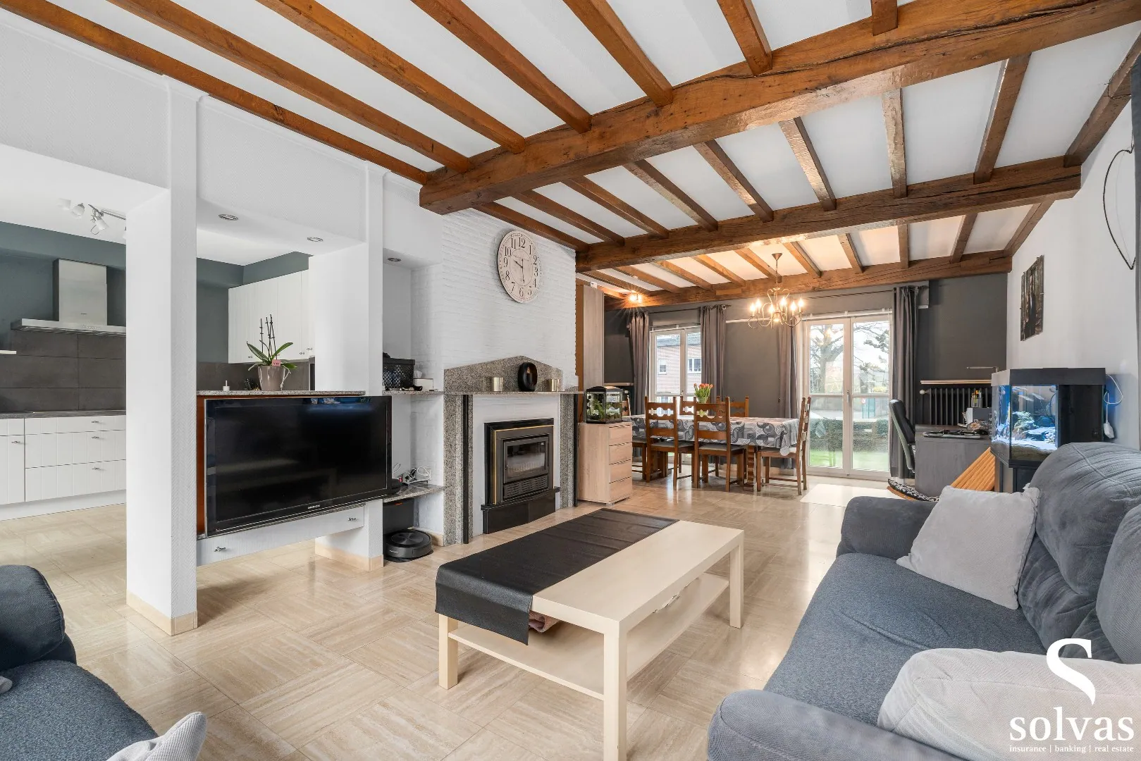 De indeling is als volgt: u komt binnen via de inkomhal met praktische inmaakkasten en gastentoilet. Vanuit de inkom heeft u toegang tot de inpandige garage met automatische poort en extra bergruimte. De lichtrijke leefruimte biedt een mooi zicht op de tuin en is uitgerust met een gezellige haard. Aansluitend bevindt zich de recent vernieuwde en geïnstalleerde keuken met alle nodige toestellen.