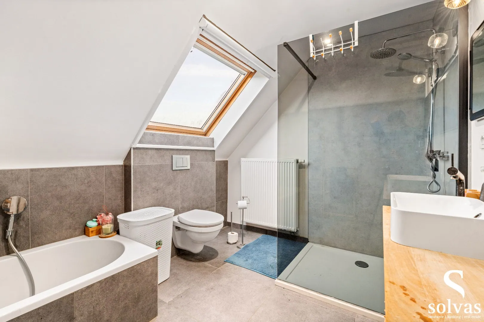Boven bevinden zich drie volwaardige slaapkamers, waarvan één met een handige aanpalende dressing als ingemaakte kasten. De badkamer is uitgerust met ... een ruime inloopdouche, ligbad en toilet. Via de nachthal bereik je bovendien eenvoudig de zolderruimte.