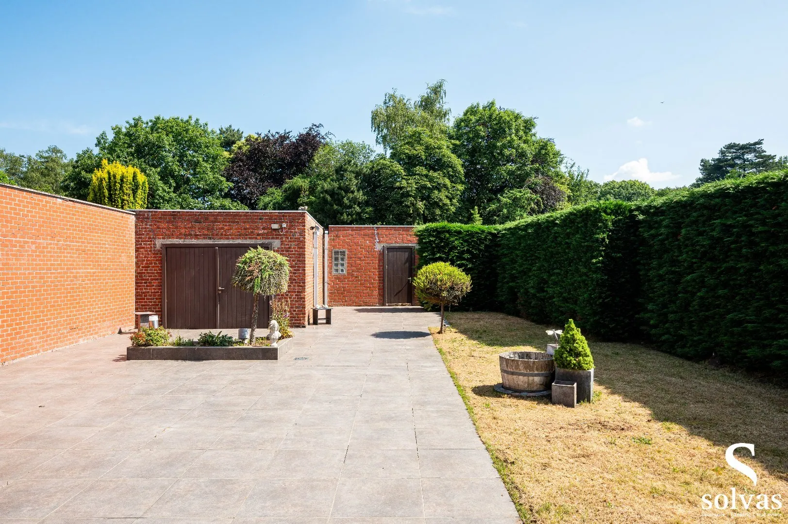 Achteraan het perceel zijn de 3 garages en werkplaats, deze zijn ook toegankelijk via de achterkant waar een doorgang is voor de wagen.
